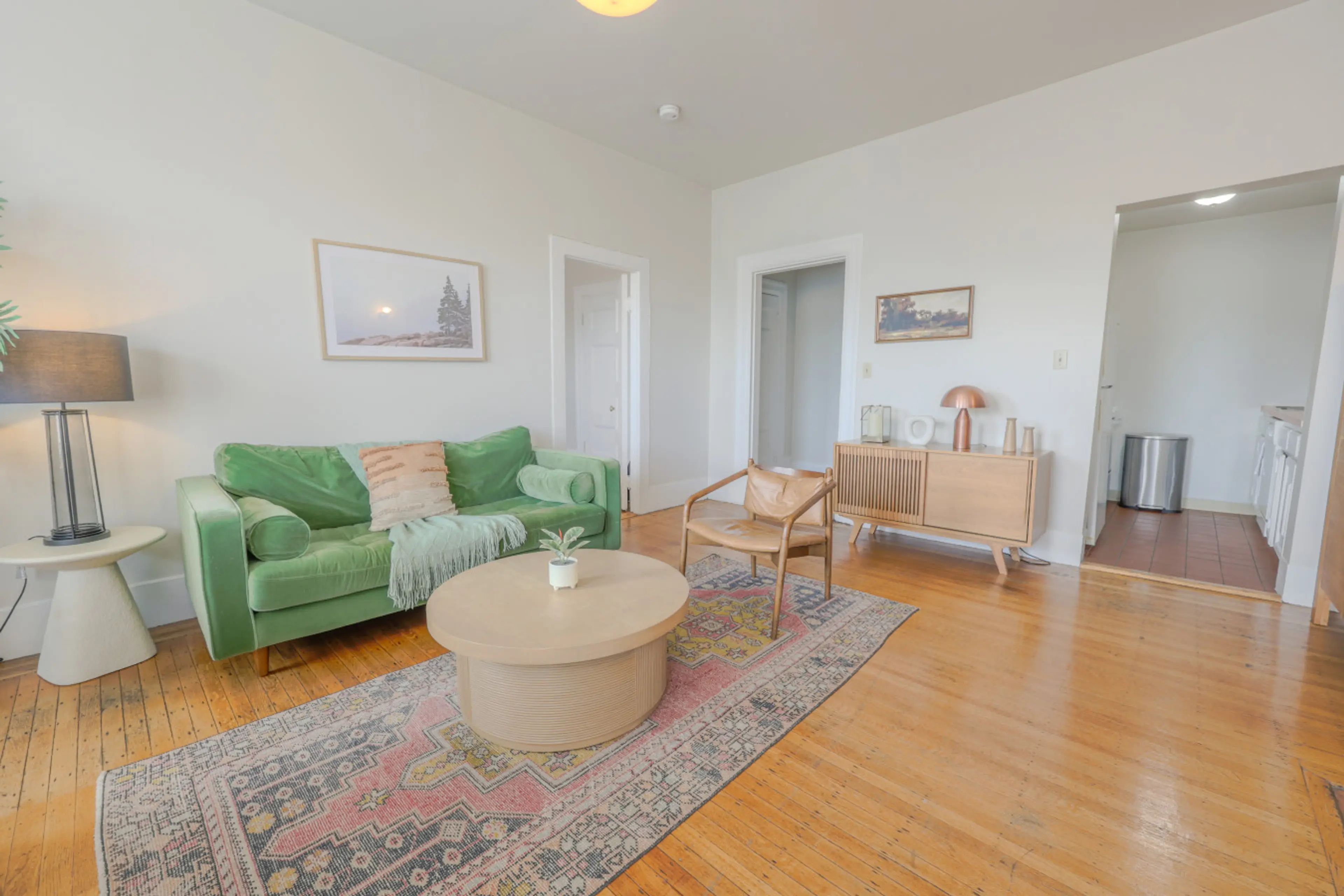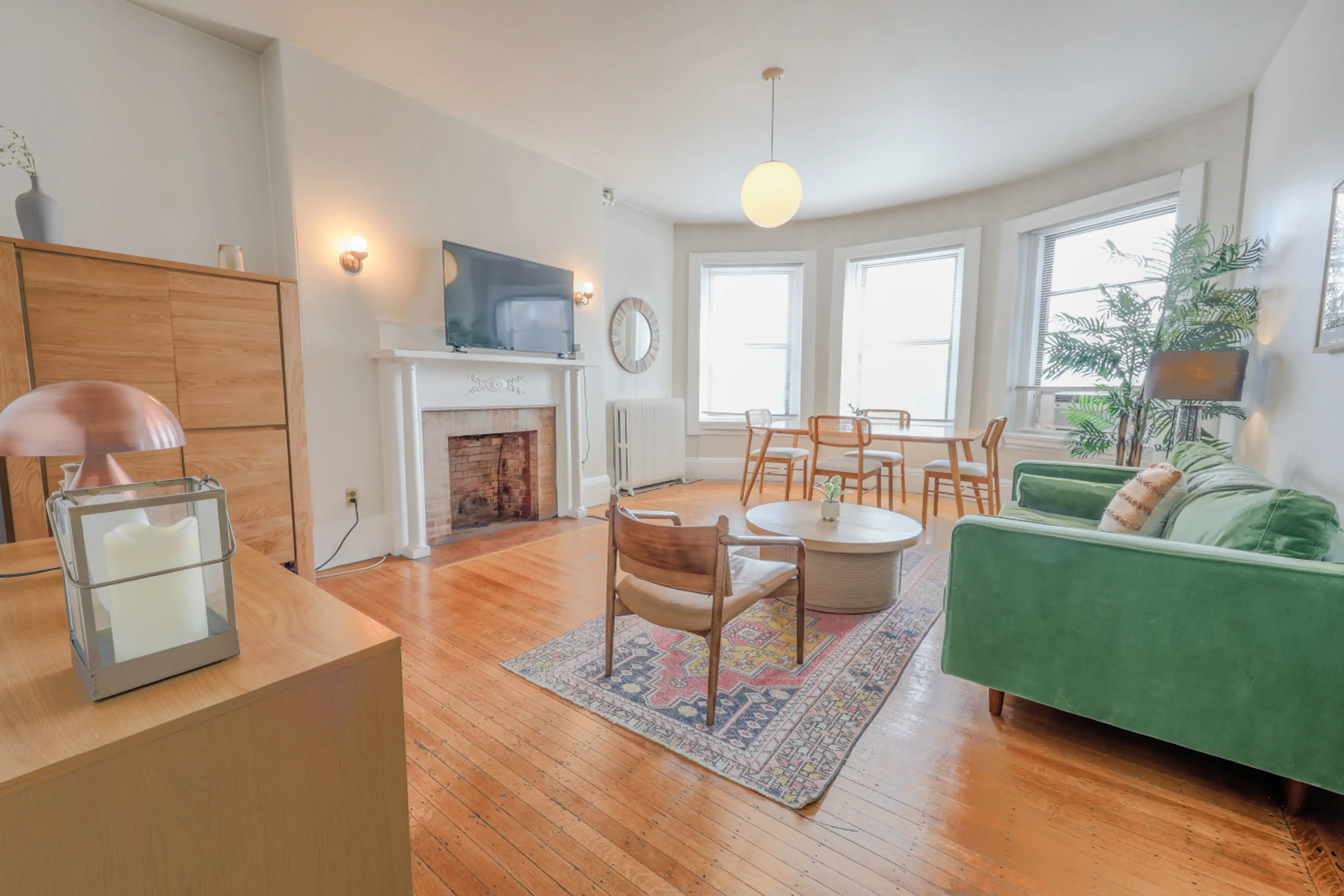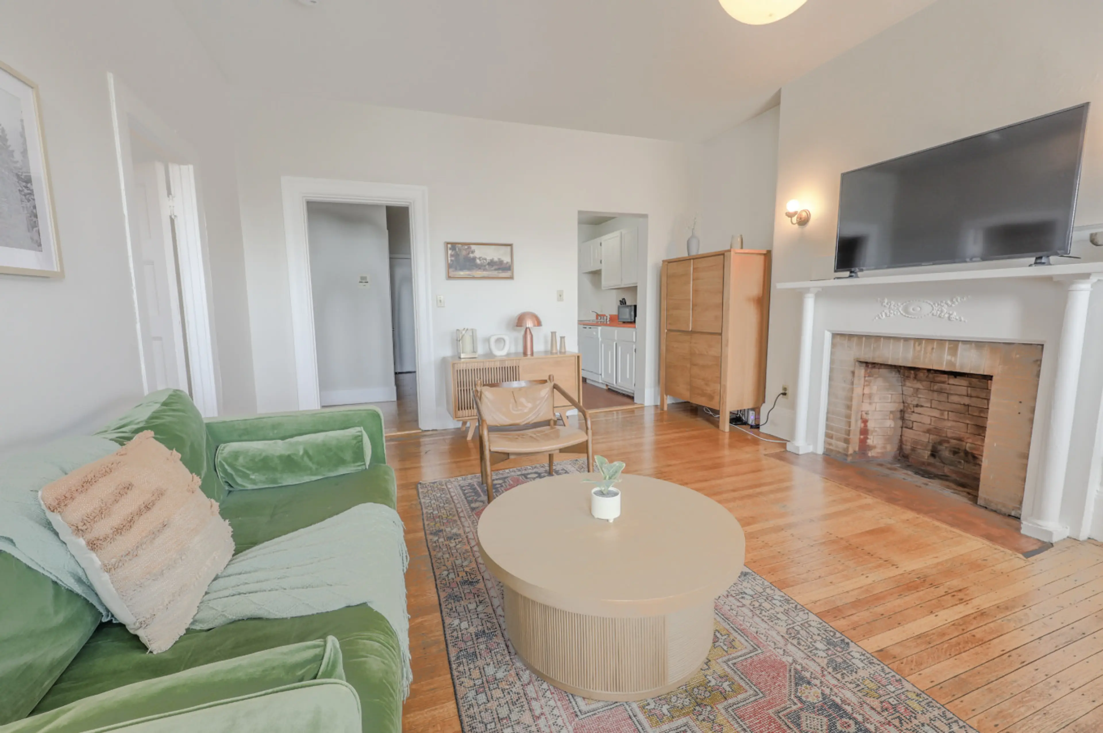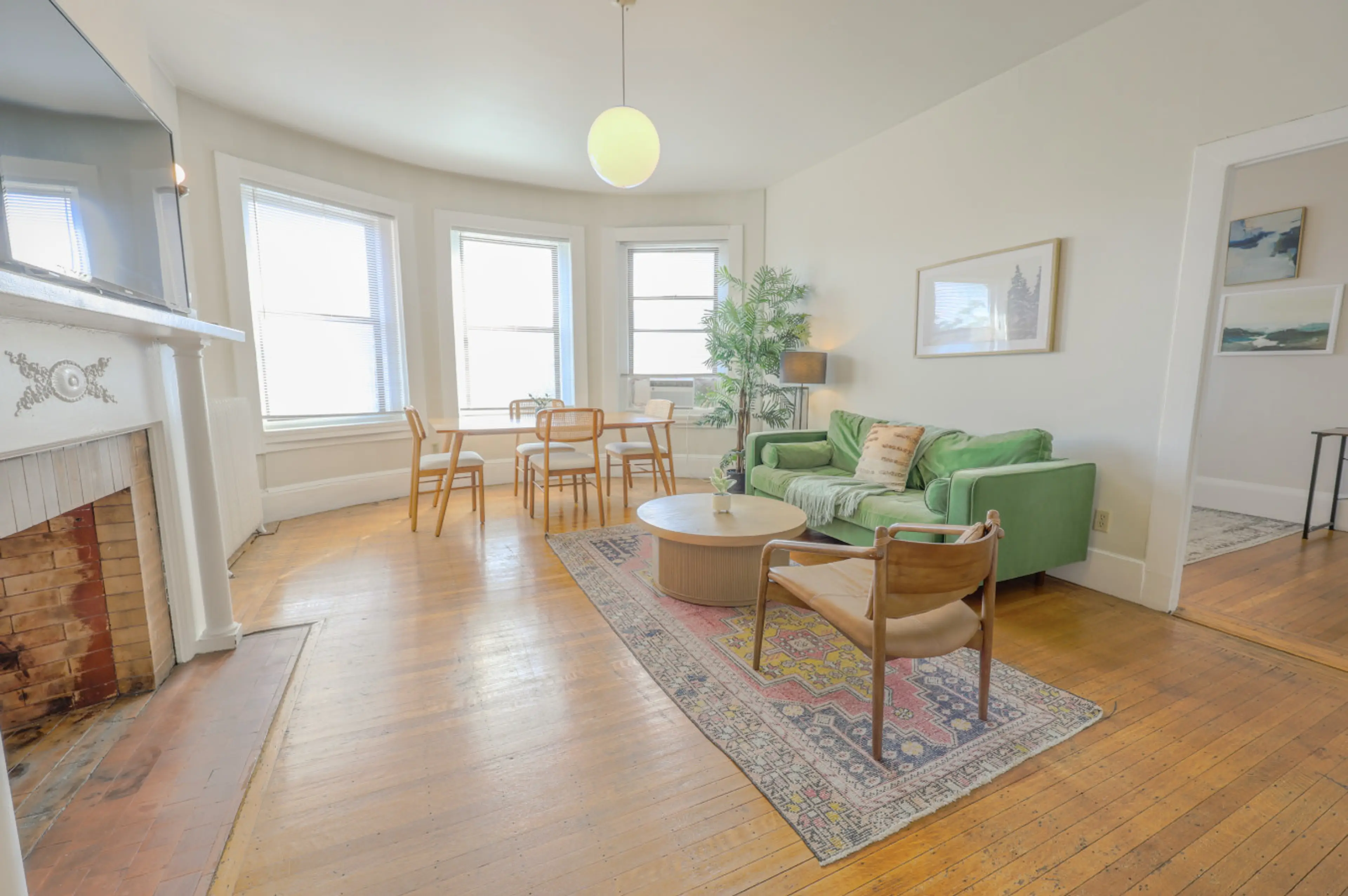 This apartment is beautifully designed with large windows and an oversized living room. The old charm of the fireplace in the living room with a twist of modern decor makes this space feel extra cozy. The dining area has seating for four and It's fully equipped with the following: Kitchen utensils ...